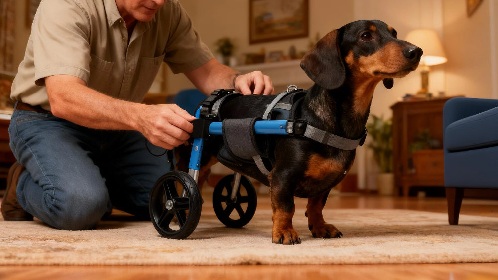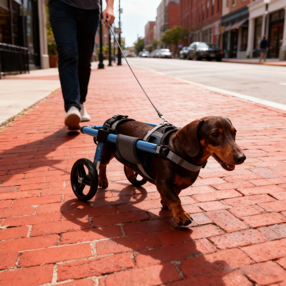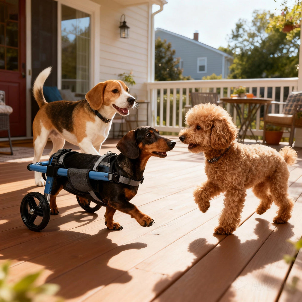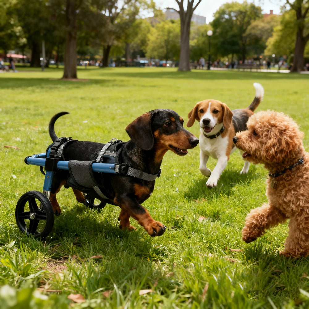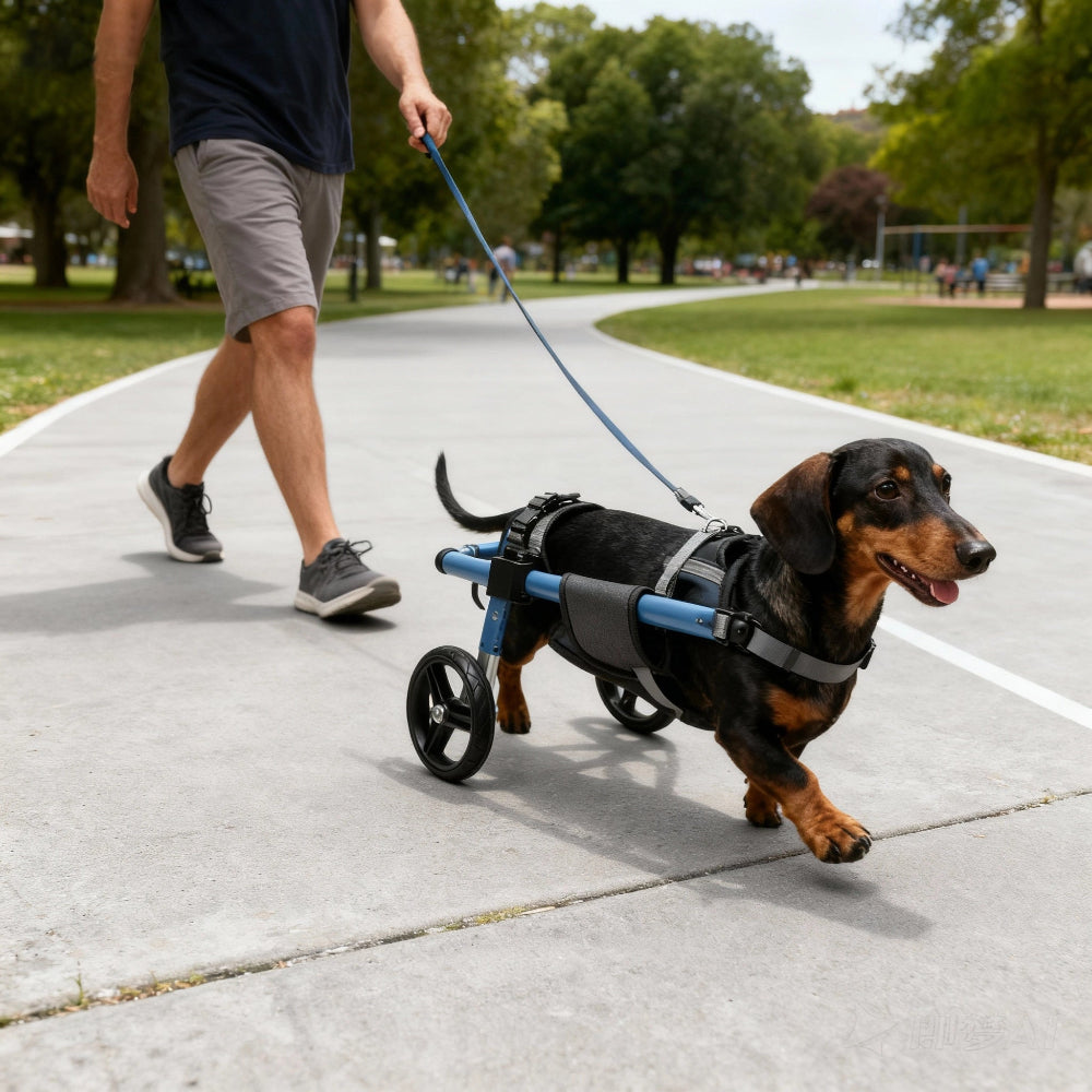 Most dogs can safely use their wheelchair for 2-4 hours per day, broken into multiple sessions. Give your dog a 15-minute break after every hour of use. Start with shorter sessions (15-30 minutes) when first introducing the wheelchair, then gradually increase duration based on your dog's energy level and comfort. Always supervise your dog and remove the wheelchair if they show signs of fatigue or discomfort.