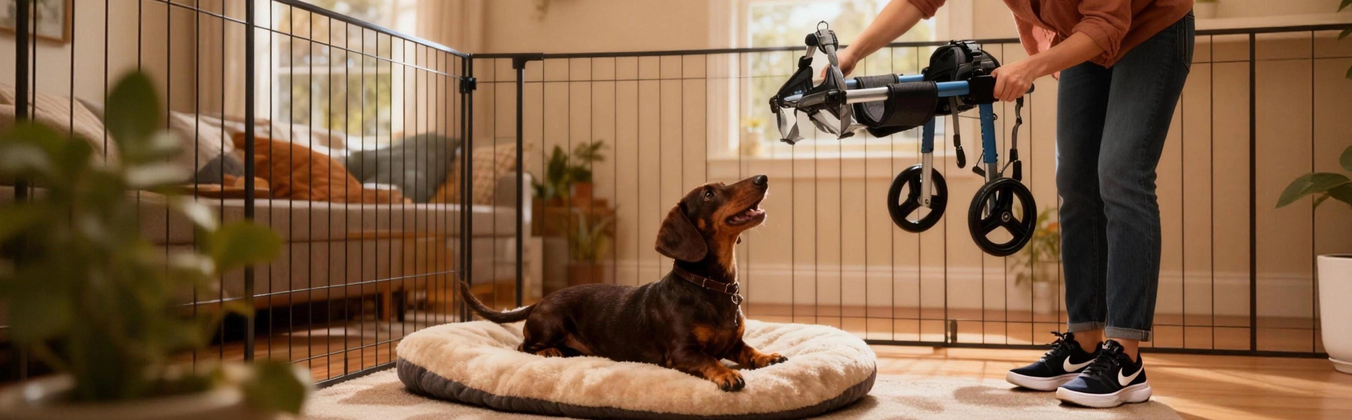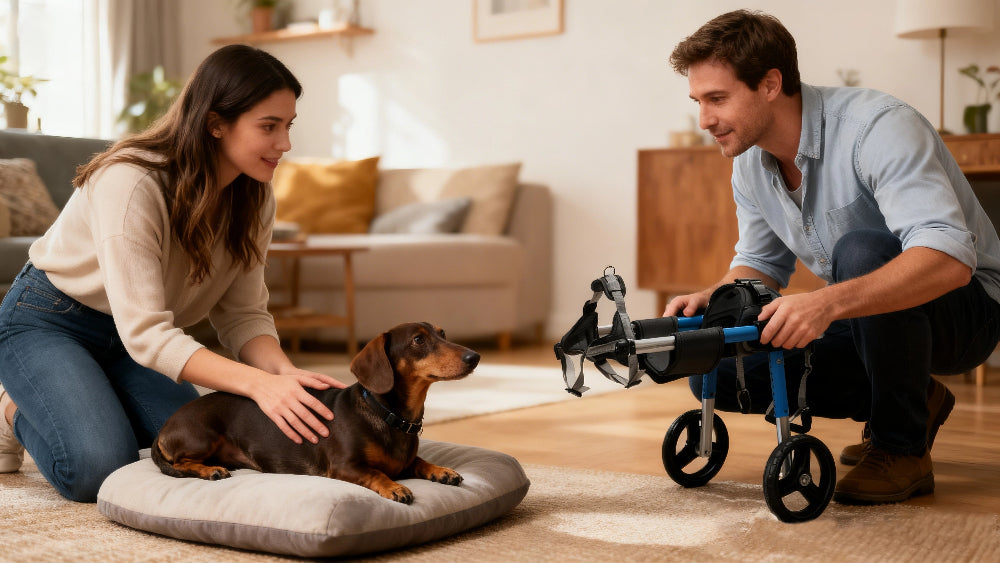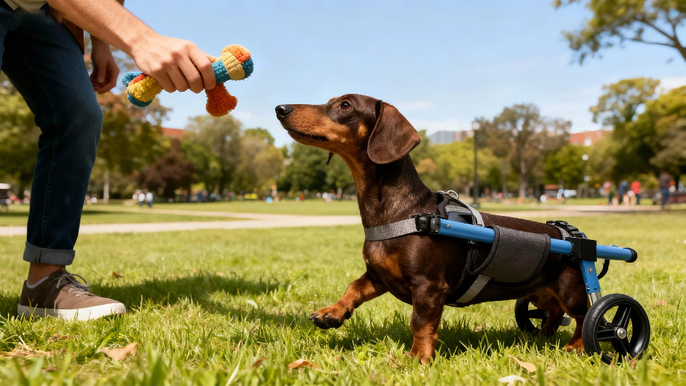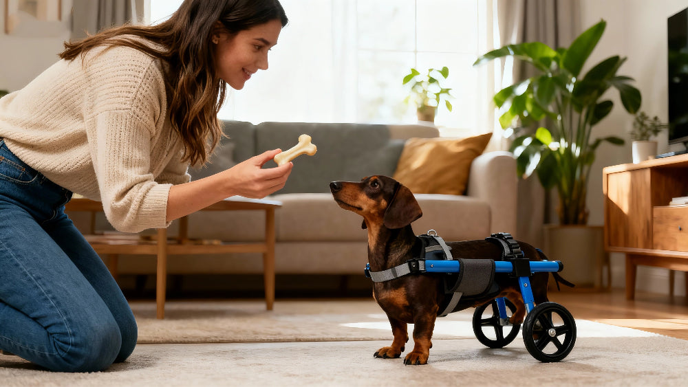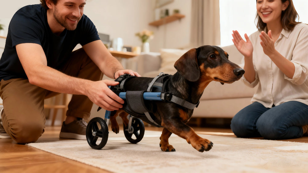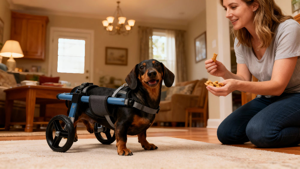 Most dogs can safely use their wheelchair for 2-4 hours per day, broken into multiple sessions. Give your dog a 15-minute break after every hour of use. Start with shorter sessions (15-30 minutes) when first introducing the wheelchair, then gradually increase duration based on your dog's energy level and comfort. Always supervise your dog and remove the wheelchair if they show signs of fatigue or discomfort.