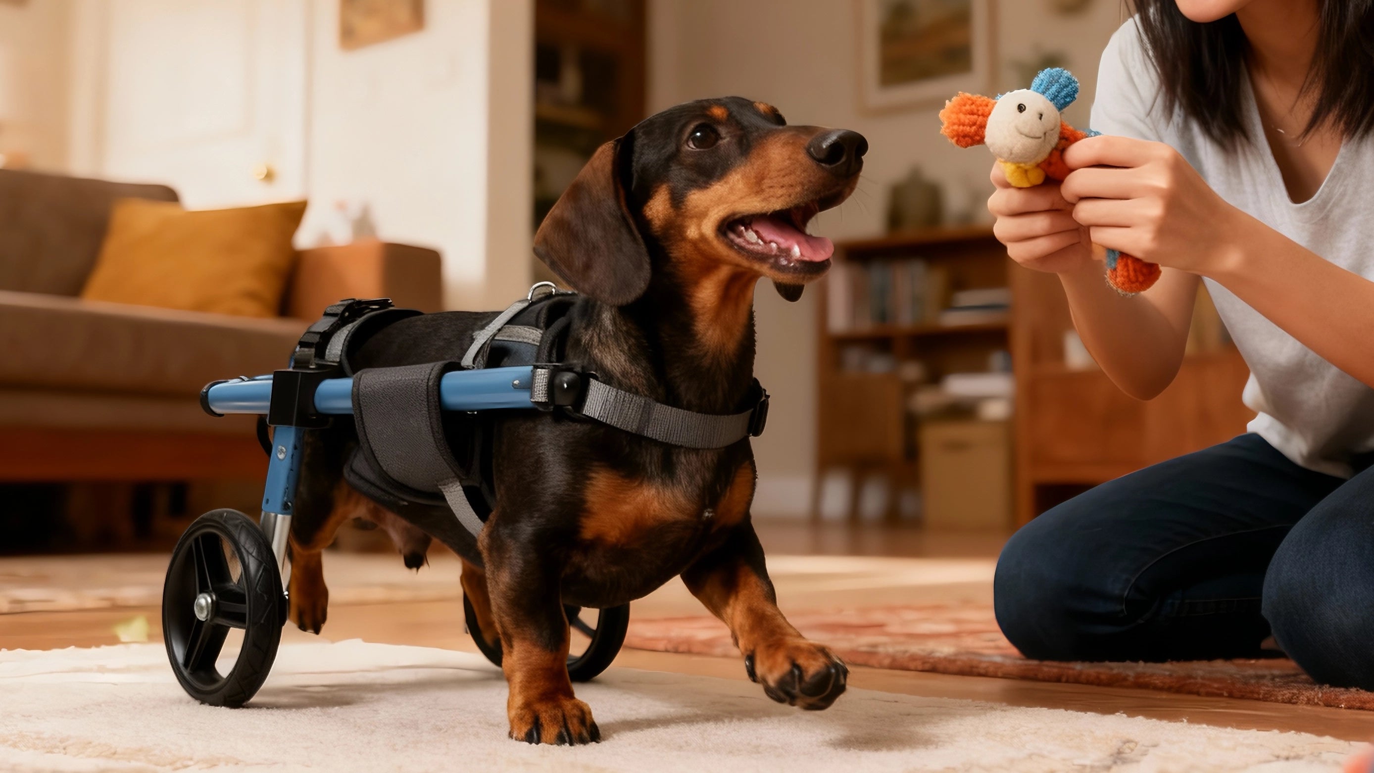 Engage your dog with their favorite toys during wheelchair time. Play helps create positive associations and distracts from any remaining hesitation.